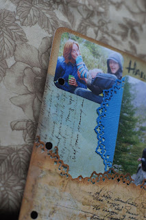Пятый разворот попроще четвертого,но и здесь есть свои фишечки-во первых тут два кармана для тэгов -на левой страничке он ввиде квитанции,состаренной ,на правой большой карман.Посвещен этот разворот нашему походу в Горный Алтай на Корокольские озера.